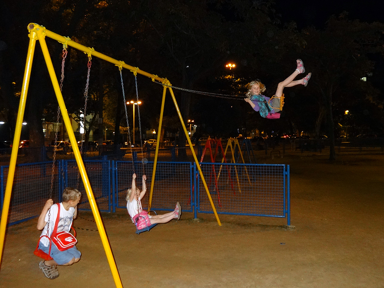 • Splatting off the monkey bars in the playground at our apartment, scratching her face on the ‘safety’ astroturf and getting a black eye.