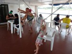 After breakfast, a lazy morning laying in hammocks, showering, snoozing back in the cabin, children running around busying themselves with friends, can crushing, making rope swings… It’s hotter today! Well we are less than 2 degrees south of the Equator. We reach a wider part of the river and after a lovely lunch of chicken meat rice and chips, need to lie in air con cabin – What a luxury! Visiting the public loos and showers briefly, I notice the hammock area near the public loos has been vacated and I consider how lucky we are to have the luxury of suite no 6!