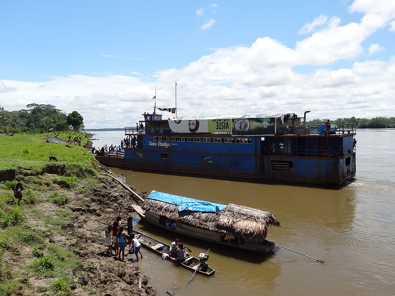 There’s a crowd of school kids of various ages on the steps of the school house and they’re using some very basic kids’ computers, all wired up to a mobile solar panel lying on the grass! The older ones are showing the younger ones and apparently they are learning some basic applications such as Word and PowerPoint. A broken sign on the school indicates something about charitable support from an American organisation. They of course have nothing as sophisticated as an Internet connection. They’re way too remote for any kind of signal. A little later, half the village turn out to buy some provisions from a mobile store/boat that pulls over on the riverbank.