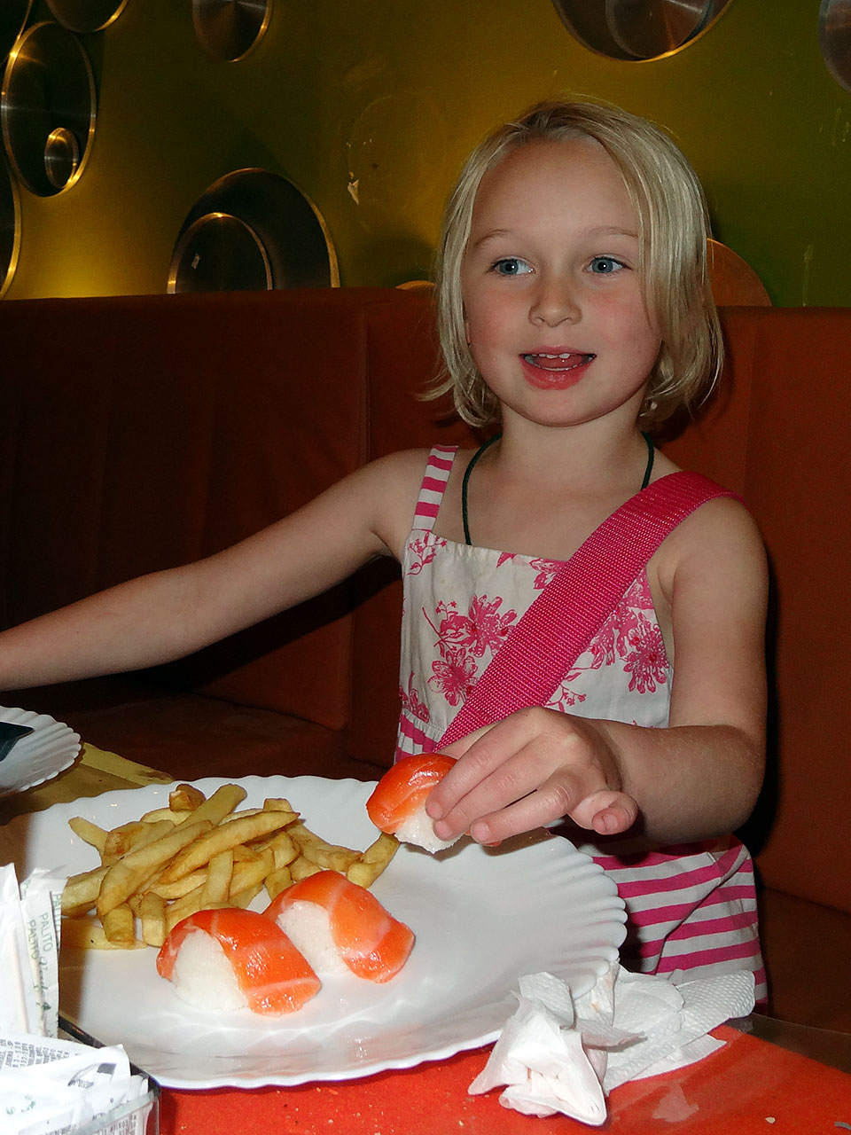 When we were in Rio I had my favourite meal when we went to a kilo restaurant where you can pick whatever you want from a big buffet and then they weigh your plate and you pay for how much you got! I got salmon sushi and chippies and then had chocolate brownie and chocolate ice cream for pudding!