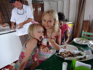 And I tried that eel too that Ben caught in the sea and Mark cooked for us, but I didn’t like it much! And I tried the piranhas that we caught in the Amazon and they were ok! And the fish we caught ourselves at the oyster bar in Boipeba in Brazil was delicious!