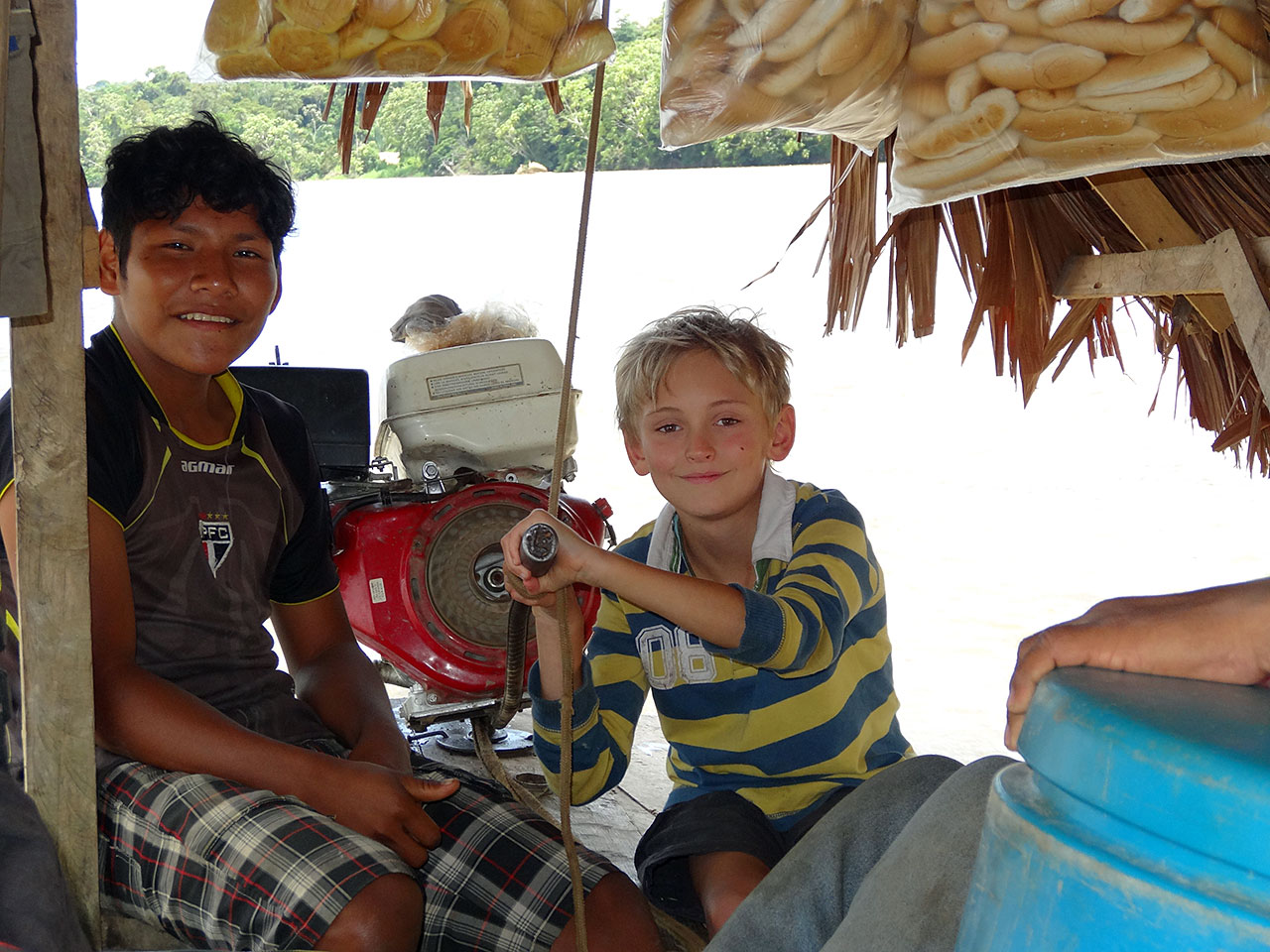 After the dolphins have breakfasted and the show is over we set off again and make good distance and arrive by lunchtime at the Peruvian border town of Pantoja. Along the way, Lara has a good heart to heart with Frank and Ben drives the boat…
