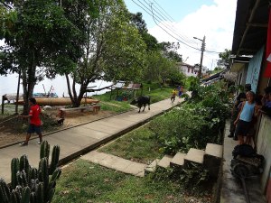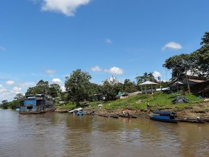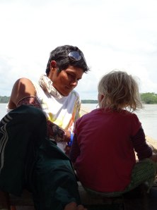We set off again after lunch, wanting to make it to Nuevo Rocaforte for the night. After two hours, the town comes into view…. Everyone is excited although we have to pull over on a small island for a loo stop and wait a while as the rain and wind gets up – and then settles again. We watch another little boat sinking in deeper waters and Gerson starts telling us stories of the many boat tragedies he knows of, including his aunt dying in a big boat accident when he was a young boy.