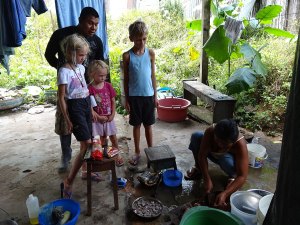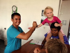 Wow – we get a really big welcome – lots of villagers pop by shake our hands and chat away to us. We can’t understand much but Gerson helps translate. One man tells us they have had just a few foreign visitors stop by before but they have never seen white/western children.
