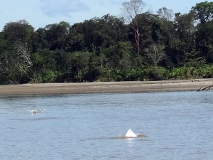We notice how polluted the river seems with huge lumps of brownish foam and Gerson says he thinks there’s a lot of pollution coming down from Ecuador but this foam is due to river movement not pollution!?! Then as we pass by a tributary that seems cleaner Zoe shrieks and we get a fabulous show of lively grey river dolphins apparently enjoying breakfast but it seems just showing off for us – some almost jump out of the water in pairs and some are just a few meters from the boat. Everyone is delighted but we do yet another shabby job of capturing much on film!