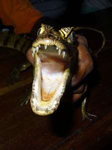 One of the most exciting animals we saw was a caiman – like a crocodile! We went out in the canoe at night with Sami our guide on the jungle trip and he shone the torch in the water looking for the reflection in their eyes, then just grabbed it!