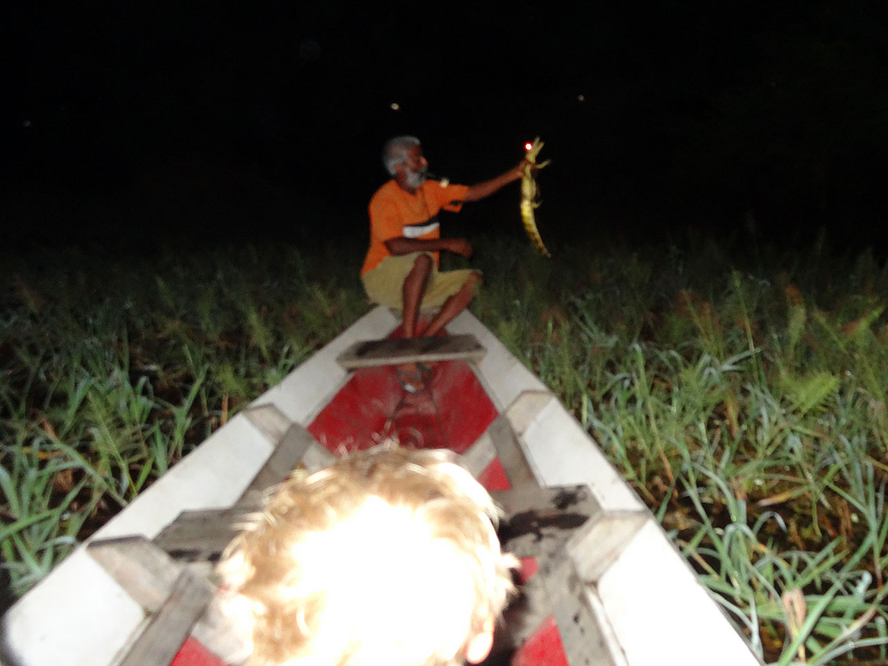 Out in the pitch black, Sami spots a caiman and grabs it!