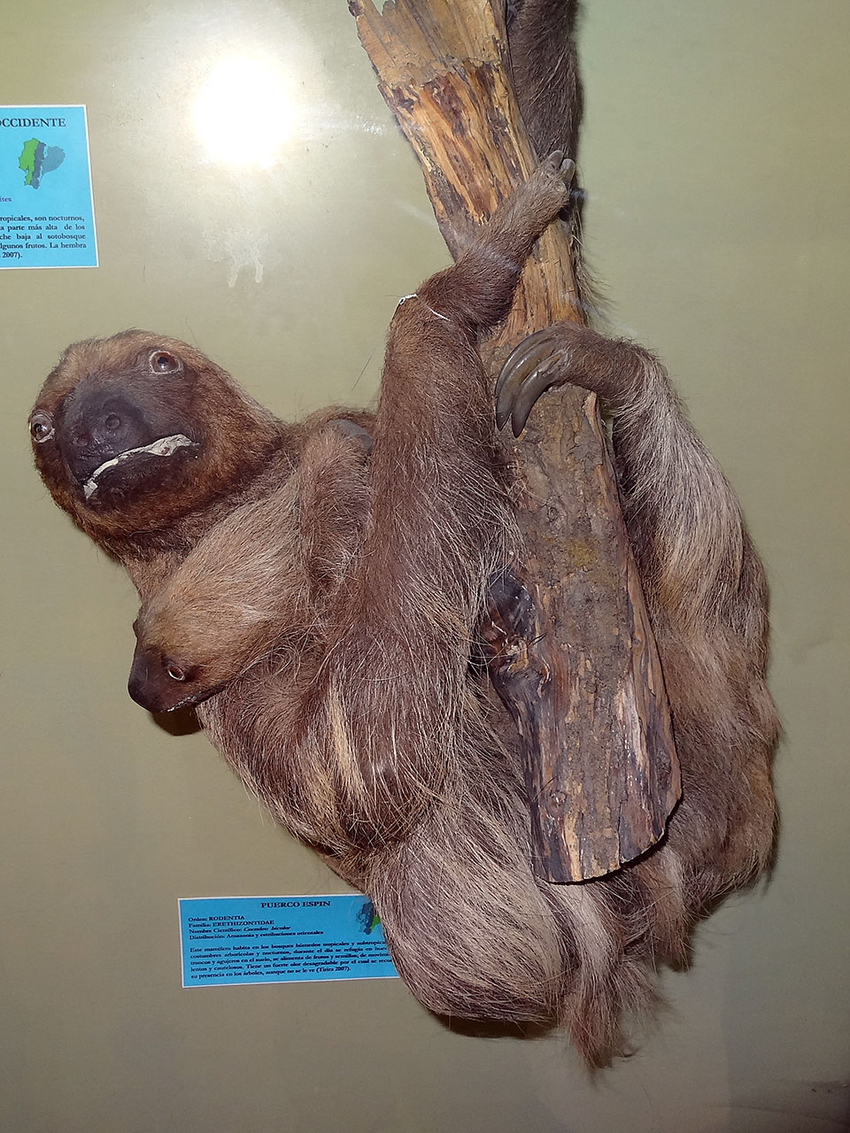 In Quito, when we’ve been to the Natural History museum, where, apart from an amazing giant mammoth skeleton, we finally saw a sloth – even with its baby…AND a spectacled Bear – but stuffed! It was interesting to see them but not exactly like seeing them in the wild!
