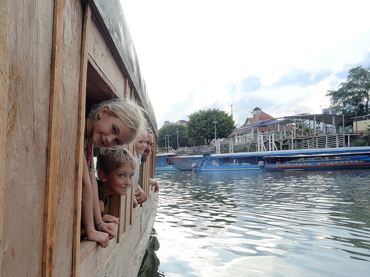 We dock on a rickety pontoon that sits at almost a 45 degree angle to the water, tipped over where the water levels are so low. Trying not to lose any bags to the river or thieves and with grumpy tired coke-less kids in tow we clamber and drag everything/everyone up to the town square where we decide I’ll stay with children and bags and Martin will find a hotel.
