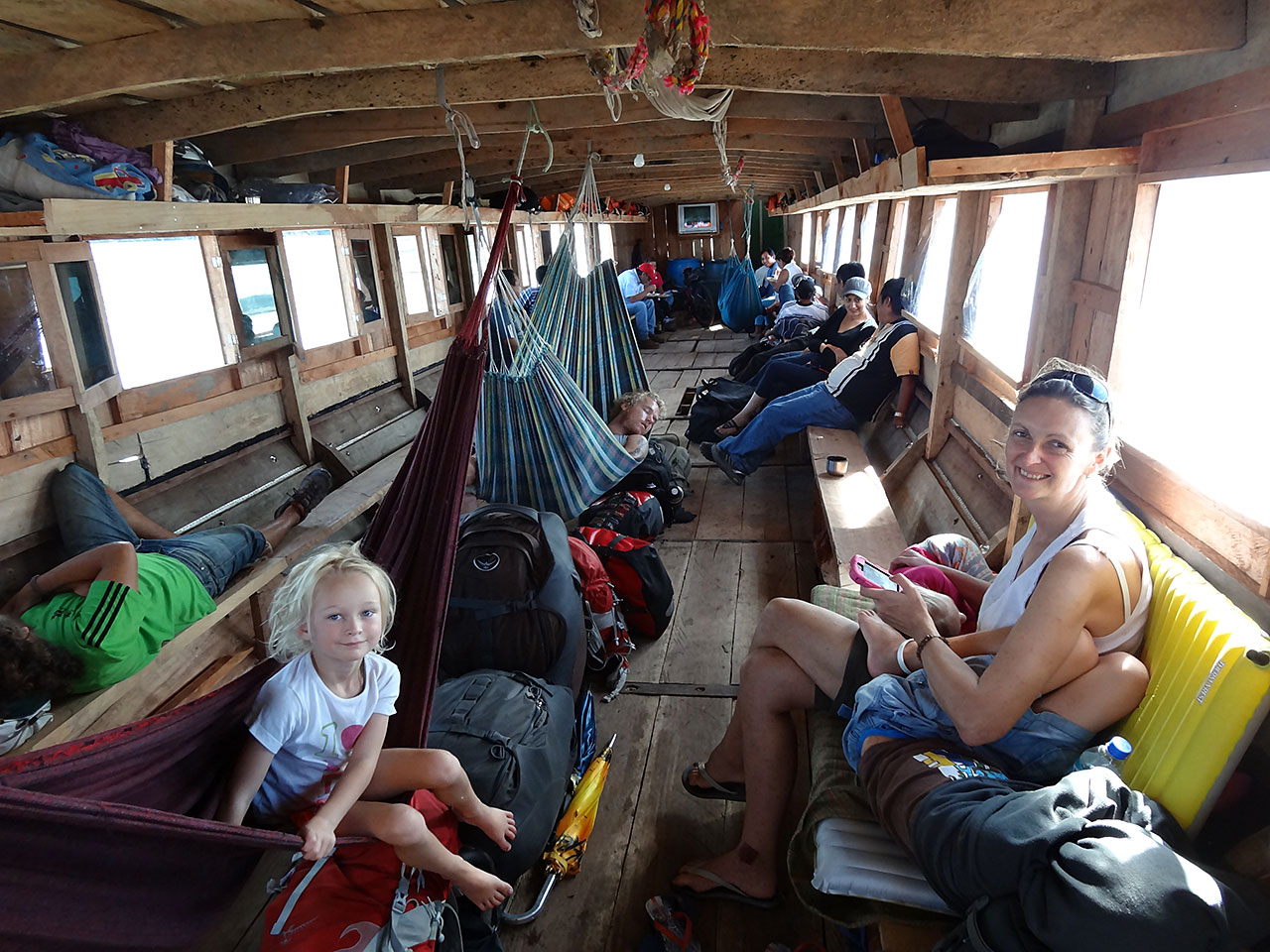 The good news is it’s not too crowded, we can hang a hammock in the middle and its relatively cool. The bad news is that it’s a long boring day with little to do, boring rice and chicken served from a tiny kitchen at the end for breakfast and lunch, no snacks and nothing else apart from cold coke but we just imposed a week long dizzy drink ban so the kids are drooling watching other people enjoy a cold coke while they are stuck with warm bottled water! We brought no other snacks – eek! The sides are mostly covered so its hard to enjoy any view so we pass the time snoozing in the hammock or on the benches, tracking our progress on my map, reading, chatting with and listening to our travelling friends play guitar and quena (a beautiful s american flute-recorder – same fingering as a recorder and similar blowing as a flute which we try but can’t get a sound from – I vow to buy one and learn, imagining being able to play the Mission theme tune!)