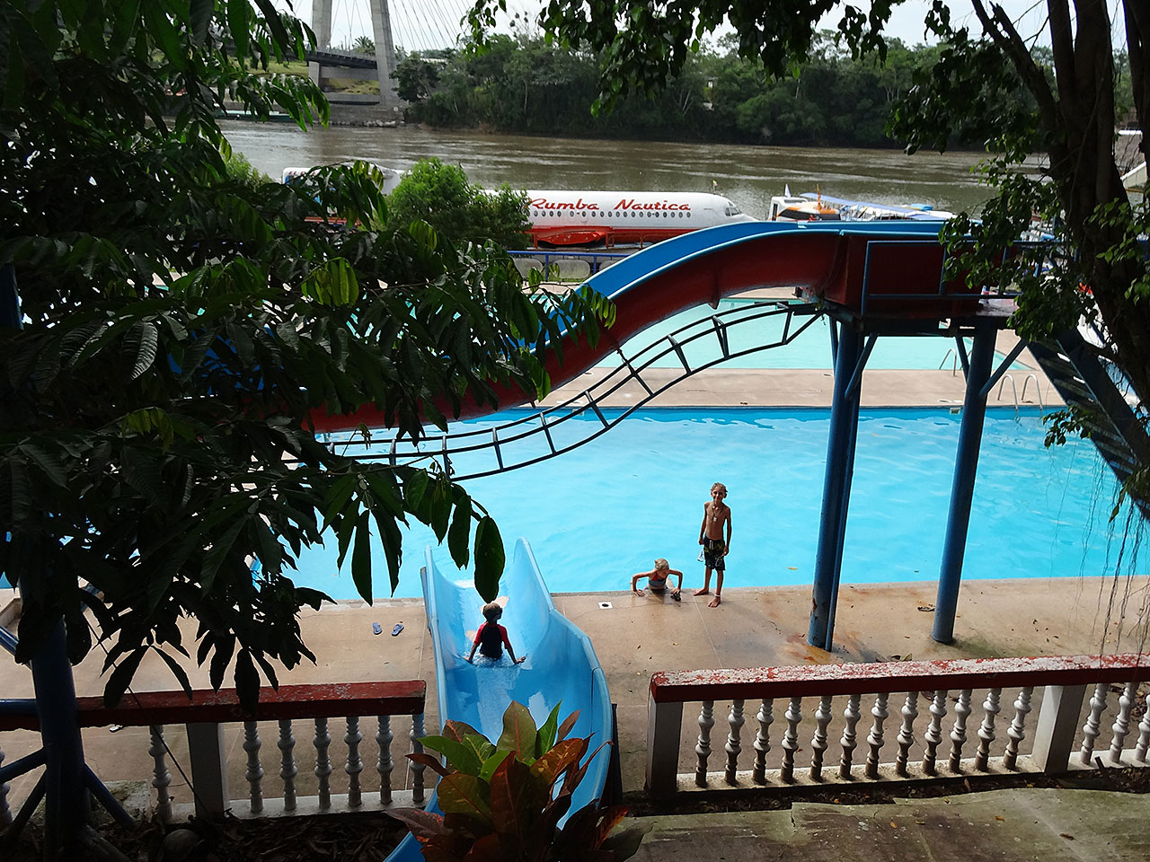 There isn’t much listed on trip advisor or Hotelbooking.com which both list only posh jungle lodgings 20km or more out of town. We’d read Coca was a bit of a dusty, dull, oil town but when we walked into Le Mision, it was clear everyone would want to stay a few days and we could wait to get to Quito where it will be much cooler and we won’t be swimming!