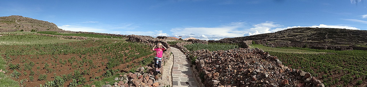 After lunch, Mama leads us up the path where we meet the other visitors and our guide and hike up the mountain to the two summits – Pachamama and Pachatata, Mother and Father peaks, passing ancient  pre-Inca terraces, many still farmed, looking out across the sparkling lake and eventually reaching the summits where there are small temple areas, in which they still hold religious celebrations.