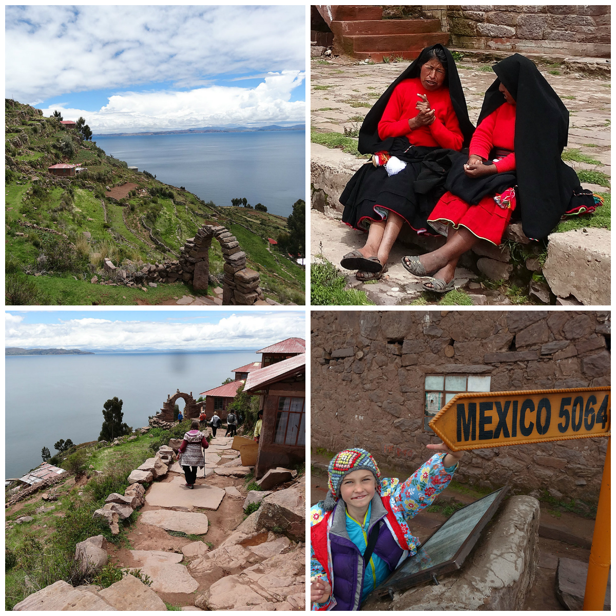 Lovely Taquile, unchanged for centuries, except the sign showing the distance to places around the globe. Zoe laments, not for the first time that we didn’t visit Mexico – Mum look its not so far, can’t we go?!