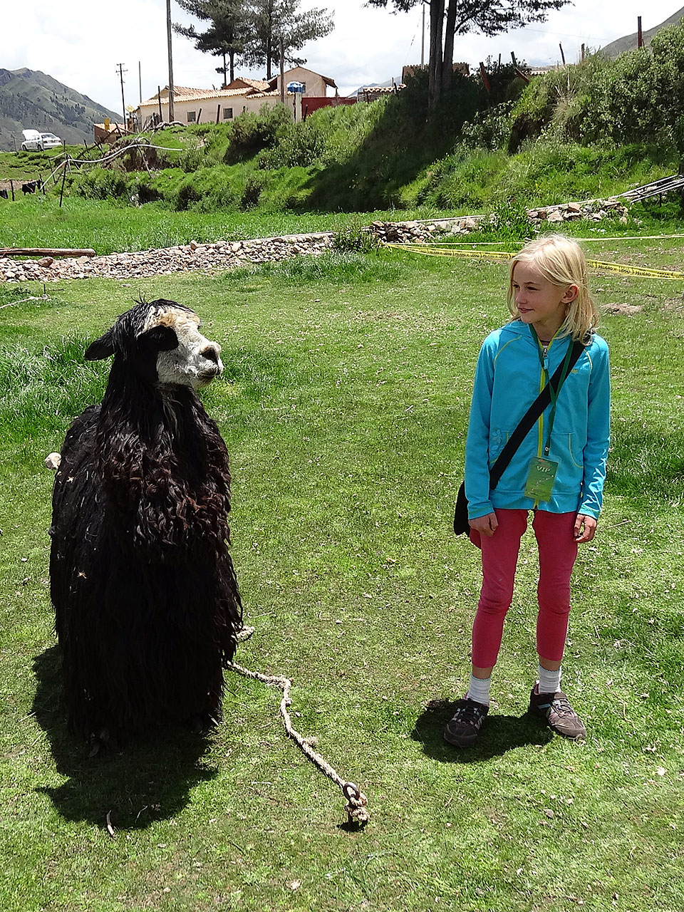 We’re introduced and allocated to families who lead us off to their homes up the steep cobbled paths. We have ‘Mama’ – we practice out best Quechuan for ‘hello, how are you?’ Then thankfully discover she can speak Spanish too. She unravels her blanket that they use to carry goods and kids on their backs scoops up and ties Lara on her back and marches off, we struggle to keep up and follow her!!