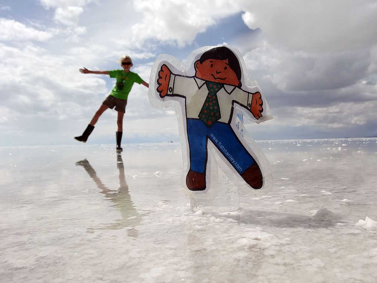 After we left La Paz we got a bus and then a train to the south of  Bolivia, travelling through amazing scenery. We saw mountains and lakes full of flamingoes and arrived in a town called Uyuni near to the biggest Salt flats in the world!  Uyuni is a small dusty town in the middle of nowhere, surrounded by salt flats, desert and more snow capped mountains. We met up with our friends again and we went to a train cemetery where you could just climb around on these old trains abandoned in the middle of the desert! Our friend Max fell through a hole in a train and scraped his chest and split his knee.  And afterwards he couldn’t walk that well but he could hobble. There was just time for Flat Stanley and me to have a quick swing and then we had to leave.