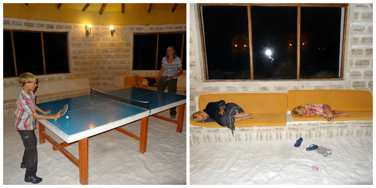 We have a wonderful night in the salt restaurant at a huge salt table. The fire roars to keep us warm and our kids give their friends a tour of our hotel before they head off across the moon-with-broccoli-scape – under a starry sky. We watch them drive the 2km or so back to their hotel, flashing their hazard lights occasionally to us! After a quick table tennis and pool match in the salt games room, we turn into our very cosy double salt room with extra mattress, for which we paid a premium for the view! This makes us especially laugh as there are views everywhere but from our room, it’s rather obscured by a dirty old water tank! Never mind, we snuggle up in our warm beds feeling excited about tomorrow’s trip on the Salt Flats!