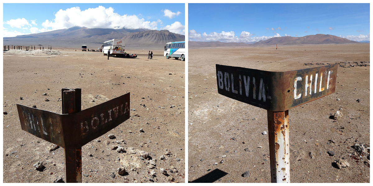 We can see the Chilean border control about a kilometre away, the countries obviously like a bit of no man’s land between them. Eventually we drive through the barrier and pull up in the middle. A neglected football field straddles the border, peace through sport? Several signs dot the border that alternate Chile/Bolivia and Bolivia/Chile, obviously no consensus on whether you need to see where you are going or coming from, confused? We were.