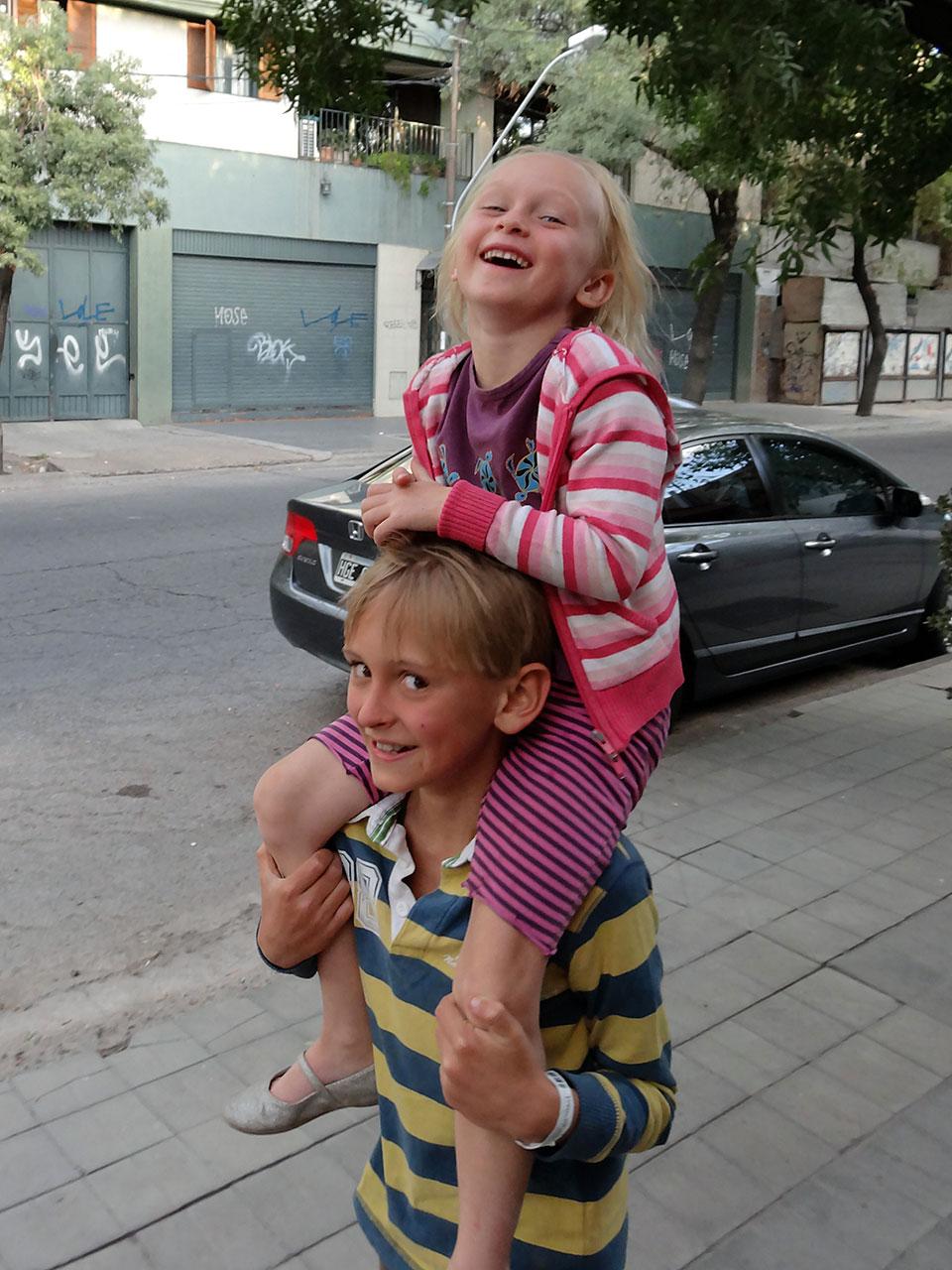 We arrive in Mendoza, Argentina at 5am. Our bus is about 6 hours late! With super sleepy kids and feeling exhausted too we gather our bags and our wits and wonder if you can get any cash or a cab at this time. A money changer offers me 6 pesos to the dollar to change a $20 bill – I know the exchange rate is 5 so I’m baffled but accept and am cautious to check all the notes I get. We soon discover there is another exchange rate – it’s called the ‘dollar blue’ aka the black market rate! There is a daily published ‘dollar blue rate’ on the internet – it’s about 7:1 at this point and climbing – more on this and how much of a difference it makes to us later! Argentina’s economy is in crisis (perhaps as a distraction President Christina Kirchner is making a lot of noise about the Falklands aka The Malvinas) again and so we’re cautious about the reception we’ll get here!