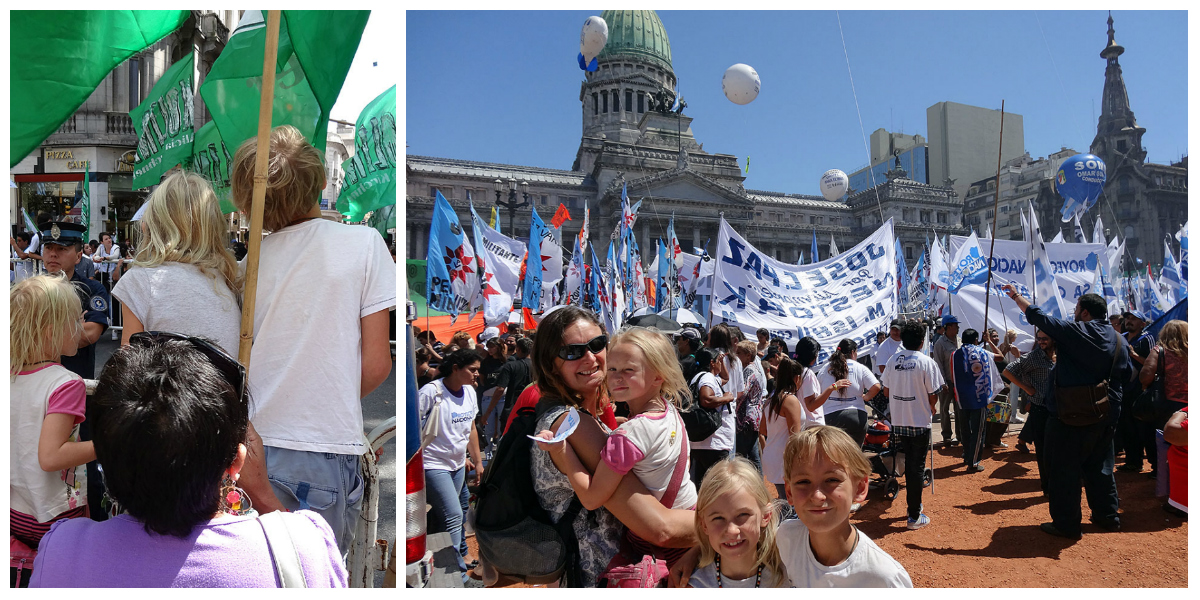 We go out and follow the demonstrators, stopping for breakfast in a café. Zoe chats with a waiter and finds out more about what’s going on. They have these massive political demos every month. Christina Kirchner, Argentina’s president drives by, up to the government office – followed by hoards of flag waving protestors and floats.