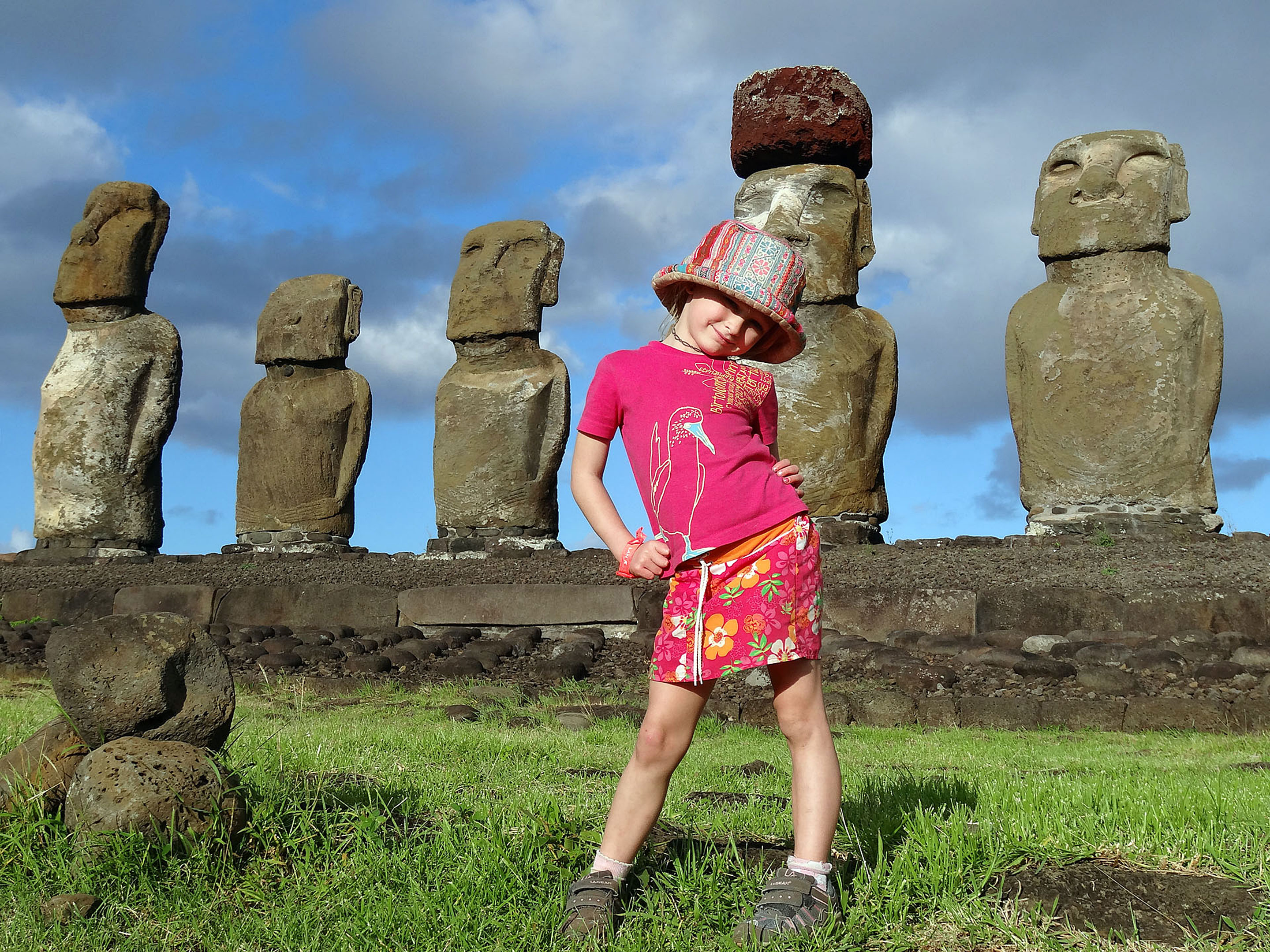 Paul holds the kids’ full attention as he explains the tragedy of the Moais quite rapidly being eroded away but the winds and rains. Just behind, are the fallen rocks where Cook blew up this Ahu looking for possible treasure!