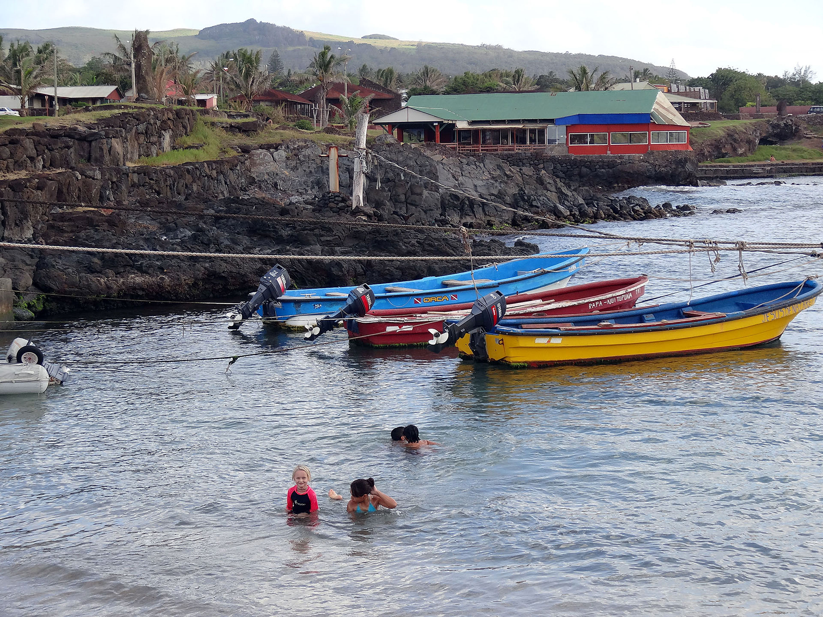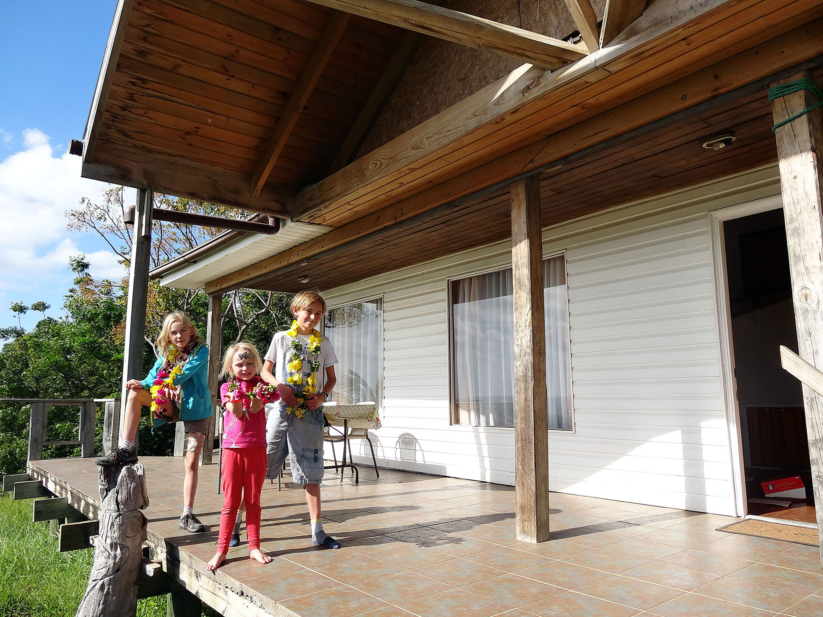 We are privileged to stay at the Tekarera Guest House with Paul, a wonderful host who is an archeologist from the US who first came to the island in the 1960s to help with the early research and restoration of the moai and returned years later, married and settled down. His passion and knowledge bring the history and beauty of the island alive for us and together with his amazing hospitality make our few days on the island very special. It’s our first welcome to a Pacific island. Each given a flower as we come into the airport terminal and then a lovely garland by Paul as he meets us. This is the typical, friendly and beautiful welcome throughout Polynesia that we come to know as we arrive in other islands too. It’s been quite a long flight from Santiago – the clocks go back a couple of hours as we edge further west. We are tired but perk up as Paul shows us around the beautiful 3 bed house which is set peacefully beside the other guest rooms with a large verandah overlooking lush woodland and the Pacific. it has a large lounge and kitchen and there’s a shelf full of games which Lara quite quickly manages to lay out all over the lounge floor, whilst Ben and Zoe start building Lego sets acquired yesterday at Kidzania in Santiago.