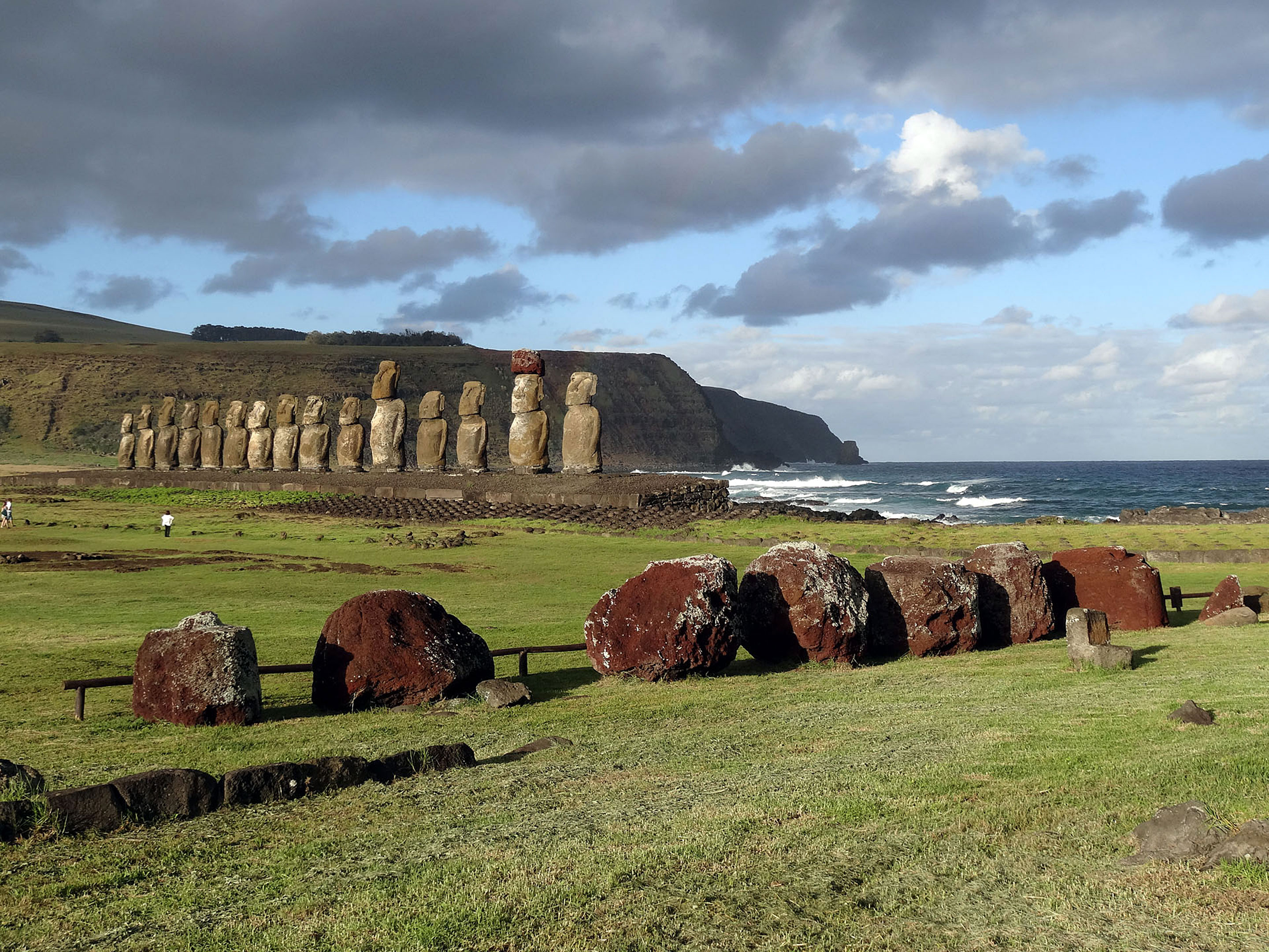Approaching the Ahu Tongarika, with Pukao (top knots or headdresses) in the foreground, never ‘restored’ to their heads. The average height of the Moai is about 4m high