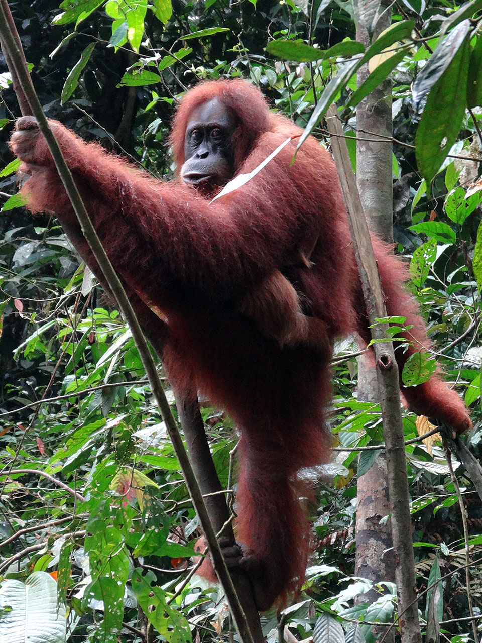 We go on an early morning jungle trek which is pretty tough … hot, humid, muddy and steep…and sadly not very fruitful in terms of spotting orangutans, but we end up at a feeding station just north of the village where they feed orangutans twice a day and bring less energetic tourists across the river and up a 20m path to see them. The feeding had just ended and the 8 or 10 tourists wander off leaving us to sit and watch two mothers and their babies hang around a bit longer and then, to our delight come and check us out at close quarters! Actually that’s quite intimidating and luckily our guide has some bananas to distract from them grabbing a camera or a bag!!