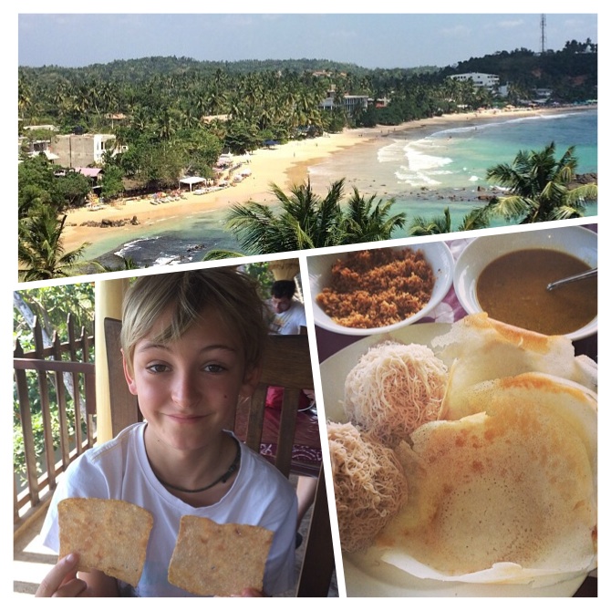 Beautiful Mirissa Beach and the view from our hotel, with typical Sri Lankan breakfasts – hoppers, string hoppers and an interesting sample of baken – which came with eggs but apparently isn’t bacon:)