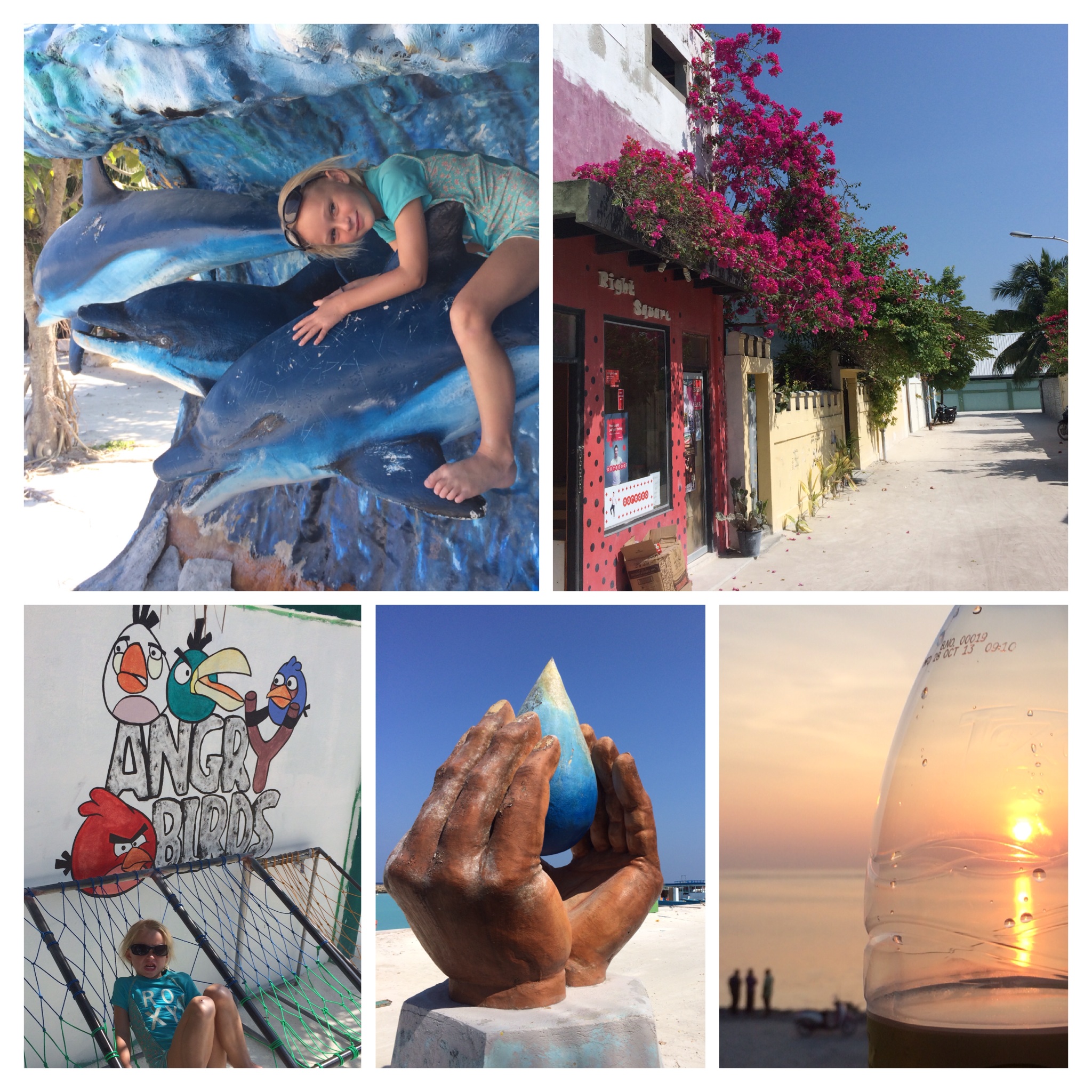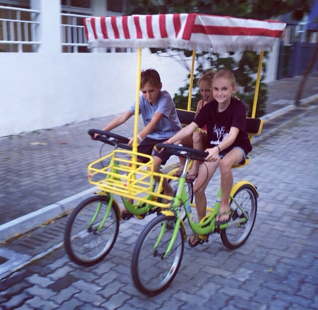 We spend a lovely week mainly in Vilimale, aka Villingili, a 10 minutes public ferry ride from Male, the capital which is a few minutes again from the airport island on the other side from Vilimale. We enjoy the quiet streets, hotel tandem bike and quad cycle, the little local beach (you must swim with conservative dress – that means I wear a costume and a pair of shorts and the kids wear their rash tops and swim shorts) and the gentle friendliness and modesty of everyone we meet.