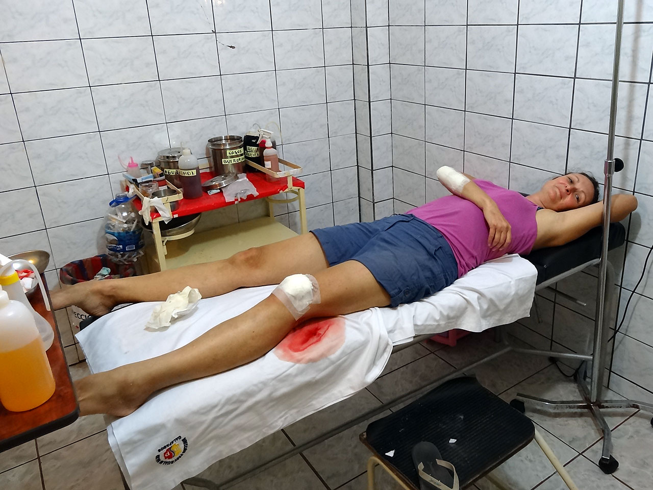 We were sitting in a restaurant going to have dinner, supper, whatever you call it. Because it was so cold Mummy was going to run back to the house to get our jackets but when she had gone about 5 meters from the restaurant she fell over and got a giant cut in her knee.