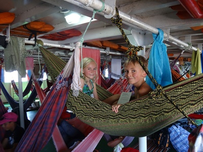 The hammocks are up and our stuff is on the cabin. The hammock area seems slightly quieter, but is not air con and open at the sides. The cabin is about the same as before – tiny but secure and just about functional, but without a fridge and with rat poison pellets on the floor under the bed that fills me with joy about the trip!!!
